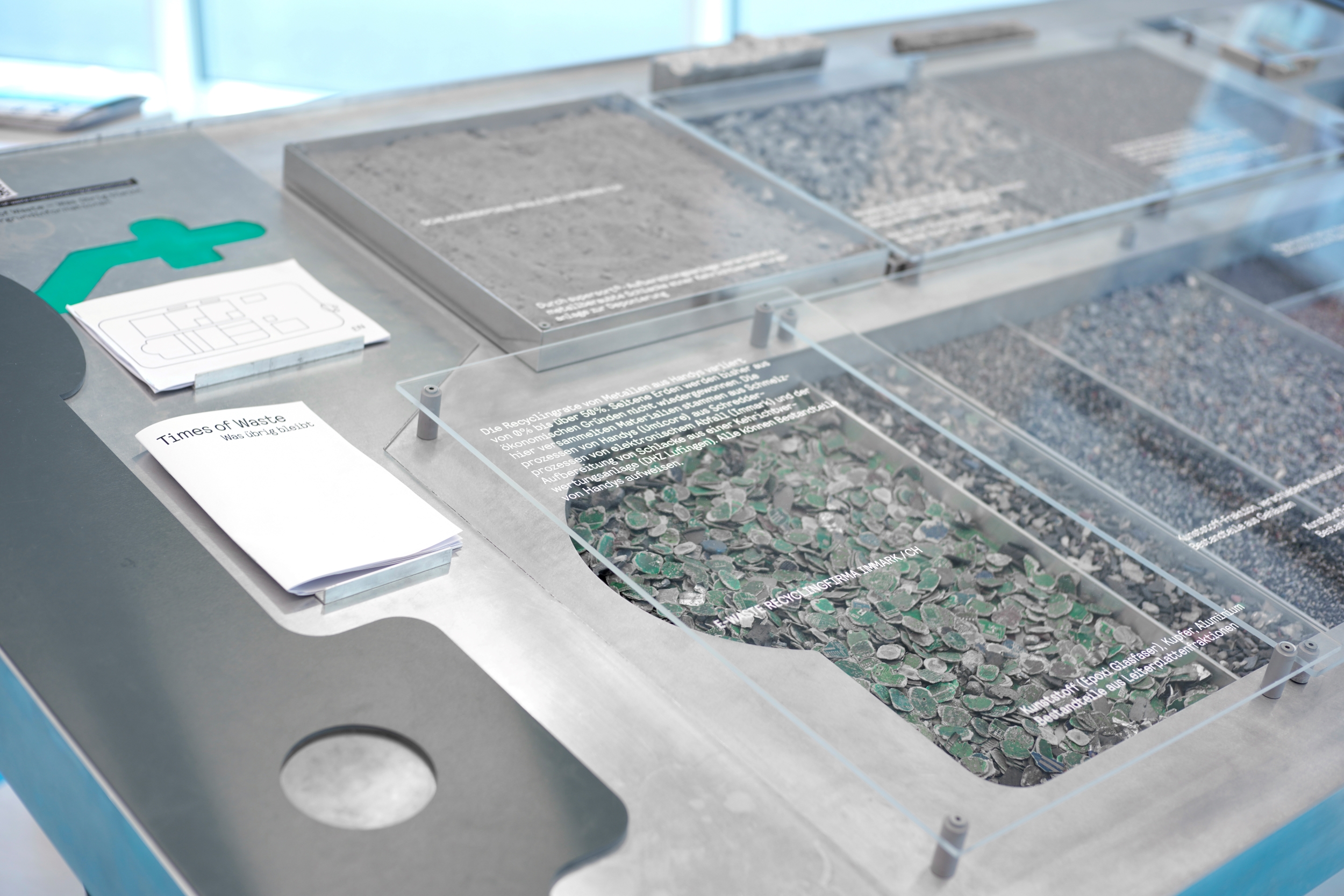 Times of Waste – Was übrig bleibt rückt das Leben eines Smartphones ins Zentrum. Das Forschungsprojekt und eine Ausstellung widmen sich einer typischen Alltagstechnologie unserer Zeit, die viele Formen von Abfall hinterlässt, angefangen bei der Gewinnung der enthaltenen Rohstoffe. Sie verfolgt die Transportwege und Recyclingrouten eines Smartphones und seiner Bestandteile, die zu Deponien und zum Schreddern, in Reparaturwerkstätten und Forschungslabors sowie zu verschiedenen Materialien und Menschen führen. Die dabei aufgezeigten lokalen wie globalen Herausforderungen werfen Fragen nach Handlungsmöglichkeiten in Zeiten des Elektroschrotts auf.