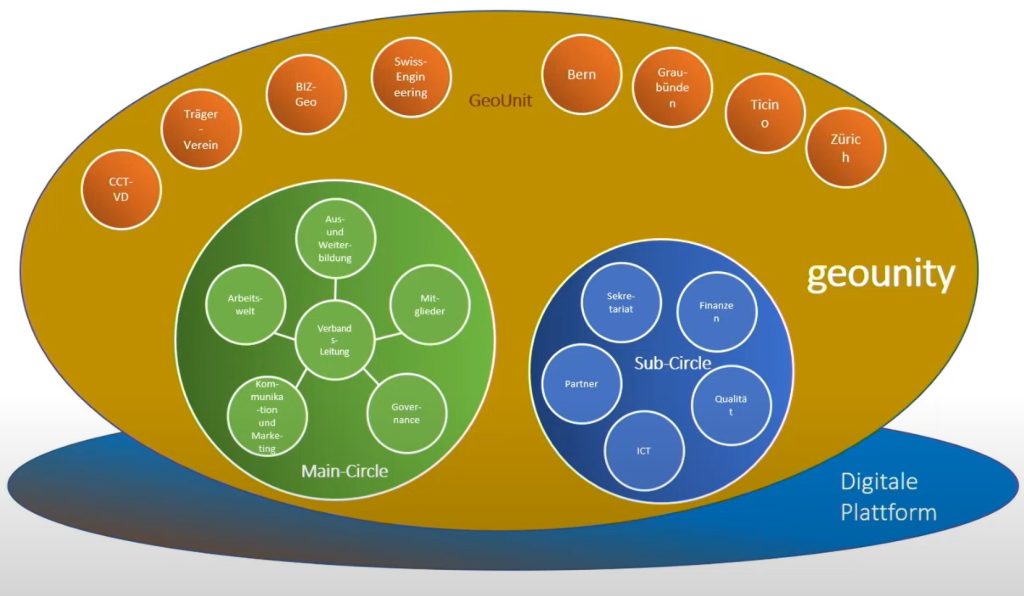 Im Gegensatz zu herkömmlichen Organisationsstrukturen vereint geounity die bestehenden Verbände FGS (Fachleute Geomatik Schweiz) und GEO+ING zu einer flexiblen und digitalen Plattform. Mitglieder können sich in einzelnen oder mehreren sogenannten GeoUnits (Abbildung 2, orange) austauschen und so in Interessengruppen über die (neusten) Fortschritte in der Geomatik-Welt austauschen. Philippe Lebert betont, dass geounity ein Netzwerk ist, indem sich Fachleute frei und ohne hierarchische Einschränkungen vernetzen können. Die Online-Plattform, die wie ein soziales Netzwerk funktioniert, wird ab dem 1. Januar 2025 bestehen.