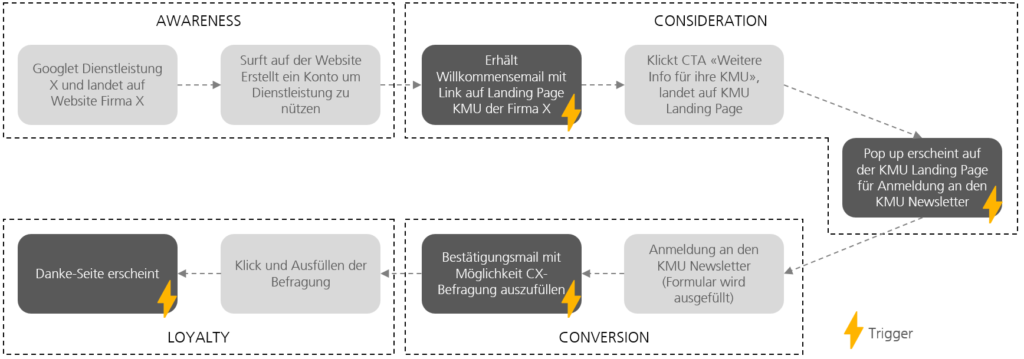 Mehrere Trigger finden statt, damit sich ein Neukunde, eine Neukundin für den KMU-Newsletter anmelden kann. Je nach Pfad sehen diese aber anders aus. Für dieses Beispiel sind die Trigger des perfekten Pfads erwähnt: