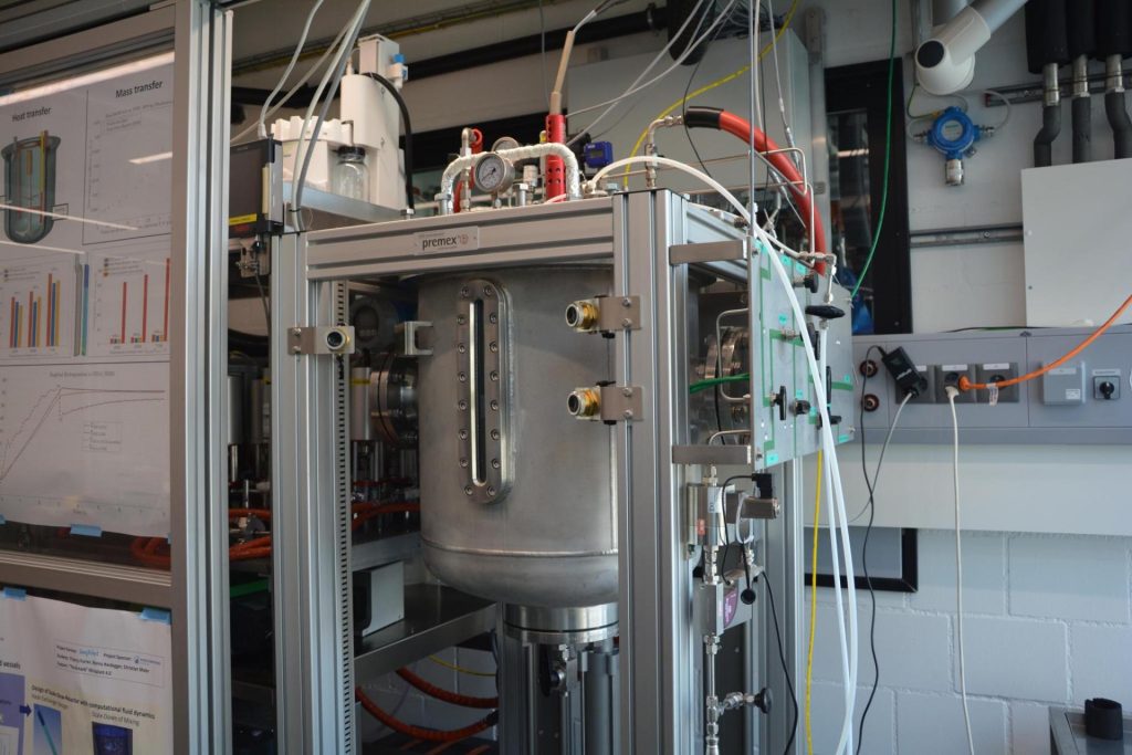 The association Miniplant 4.0, collaborating with Prof. Dr. A. Zogg’s team, has introduced an novel Scale-Down-Reactor. Located within the FHWN-HLS process technology center, this reactor features a heat exchanger known as heating/cooling-finger (H/C-Finger), replicating heat transfer characteristics of full-scale production plants. This 3D-printed H/C-Finger, available in materials like stainless steel, Hastelloy, and glass, enables early-stage investigations on the effects of wall temperature and materials used in the processes. The Scale-Down-Reactor thus shortens the development time and minimizes the needs for intermediate process trials in pilot scale equipment. Furthermore, the Scale-Down-Reactor enhances laboratory safety through a pressure-proof enclosure, ensuring containment in case of glass reactor breakage and thereby minimizing potential risks to lab personnel.