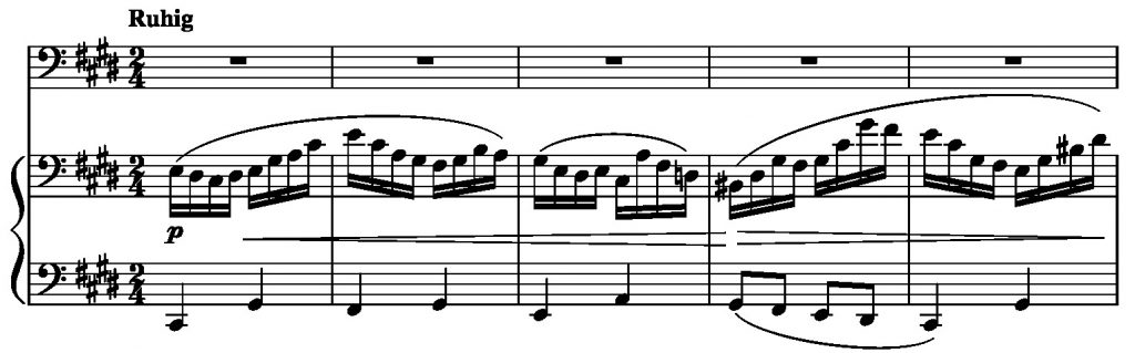 Das Eröffnungsthema beginnt mit einer reinen Quinte, entwickelt sich dann in den Haupttönen von Cis Moll auf eine sehr natürliche Weise, die an ältere, fast archaische Musik erinnert.
