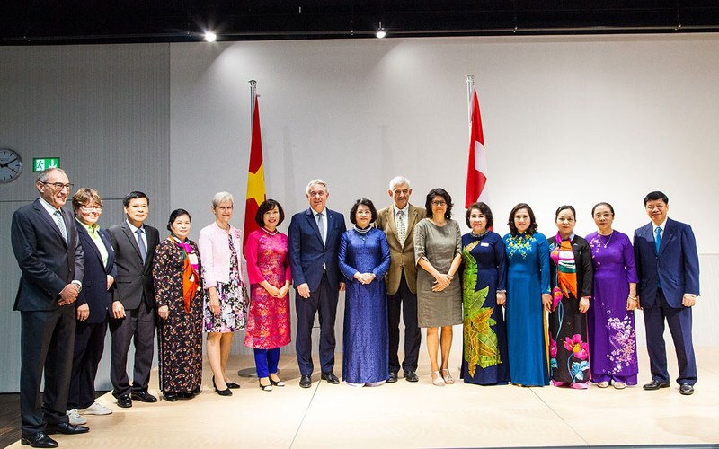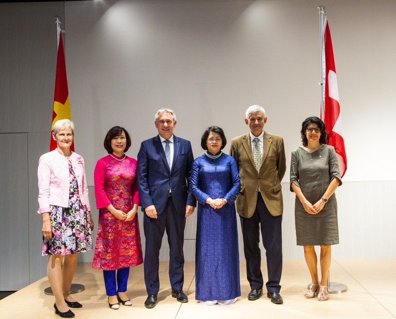 v.l.: Heidi Ammon (Gemeindepräsidentin Windisch), Le Linh Lan (Botschafterin Vietnams in der Schweiz), Alex Hürzeler (Regierungsrat Kt.AG), Dang Ngoc Thinh (Vize-Präsidentin von Vietnam), Crispino Bergamaschi, Barbara Horlacher (Gemeindepräsidentin Brugg)