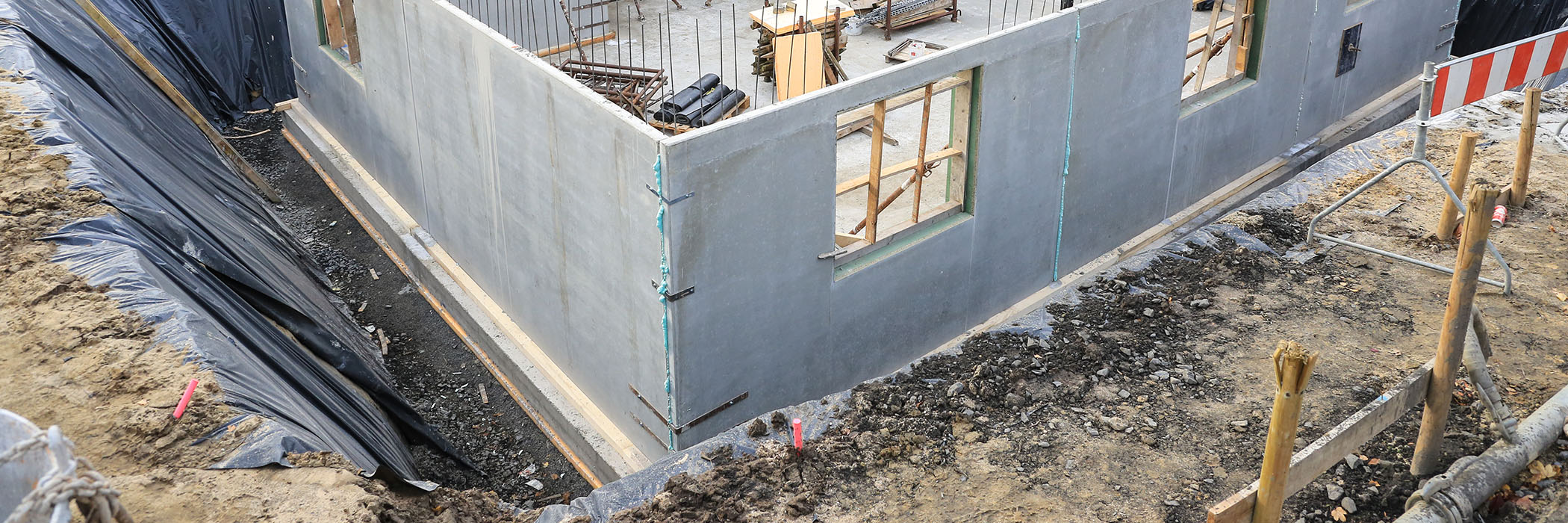 Auf dem Bild ist eine erdreichangrenzende Aussenwand n der Erstellungsphase einer Liegenschaft zu sehen. Mit radondichten Aussenwänden soll Radon abgeschottet werden können, so dass Aufenthaltsräume in Untergeschossen von Gebäuden erzielt werden können.