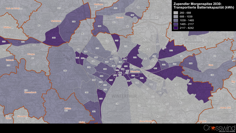 Wir beobachten in unserem Umfeld, sowohl in der Privatwirtschaft als auch in der Verwaltung, eine steigende Nachfrage nach Know-how im Umgang mit (offenen) Geodaten, insbesondere in den Bereichen «Energie» und «Mobilität». Aus diesem Grund steht während des Kurstages ein Praxisbeispiel für Location Intelligence im Fokus: Es geht darum, für das Jahr 2030 abzuschätzen, wie viel Batteriekapazität Personen, die morgens mit einem E-Auto in eine Stadt pendeln, theoretisch über Vehicle-to-Grid-Technologie zur Verfügung stellen könnten (siehe Abbildung mit dem Beispiel «Winterthur»). Diese transportierte Batteriekapazität könnte zukünftig dazu beitragen, das Stromnetz zu stabilisieren. Durch solche Anwendungen sollen die Kursteilnehmenden die Möglichkeiten und die Bedeutung von Location Intelligence erkennen und dazu inspiriert werden, dies in ihren eigenen beruflichen Alltag zu integrieren.