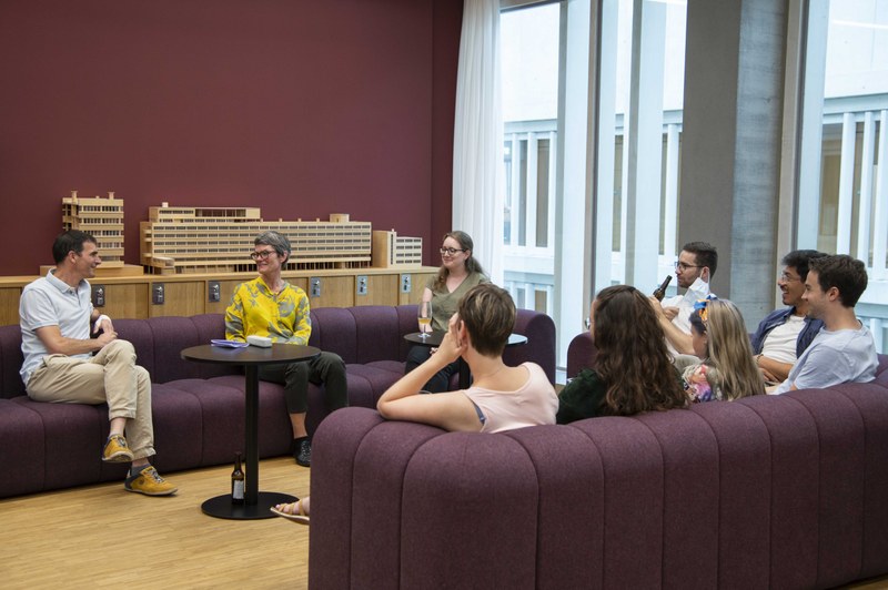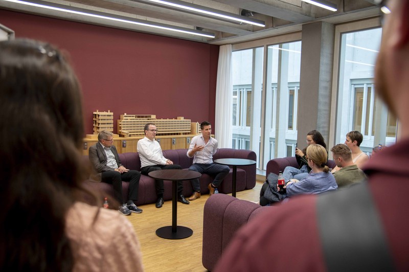 Auch die Besucher*innen des Anlasses scheinen dieses Interesse geteilt zu haben. Das Bedürfnis für neue Ideen, Konzepte und Lösungsansätze scheint in der Branche weit verbreitet und stetig zu wachsen. Aus diesem Grund entwickelten sich schnell spannende Diskussionen zwischen Studierenden, Fachexpert*innen, Forschenden und den Gästen der Veranstaltung sowohl spontan in kleinen Gruppen als auch bei den geplanten Sofagesprächen mit verschiedenen Fachexpert*innen und Studierenden. Unter den Gästen war auch die ERNE AG Bauunternehmung zu finden, die ihren Weiterbildungstag bei uns verbrachte. Die vielseitigen Diskussionen konnten so zusätzlich von spannenden Praxisinputs profitieren.