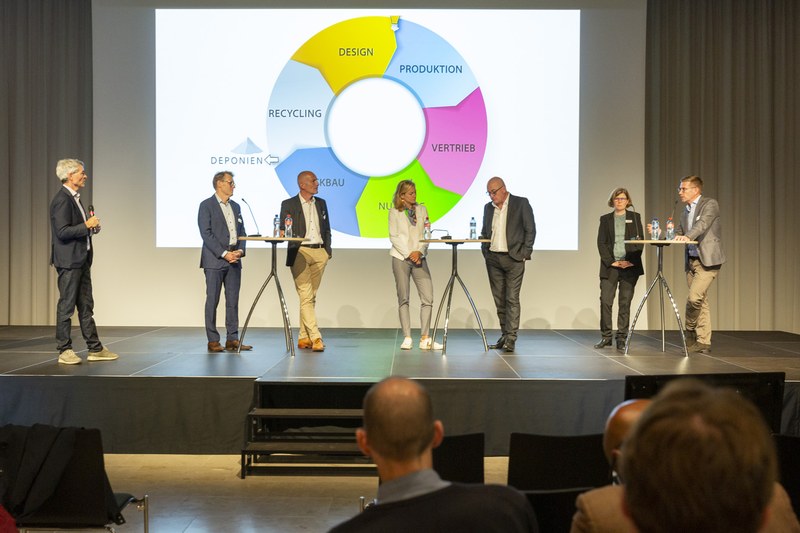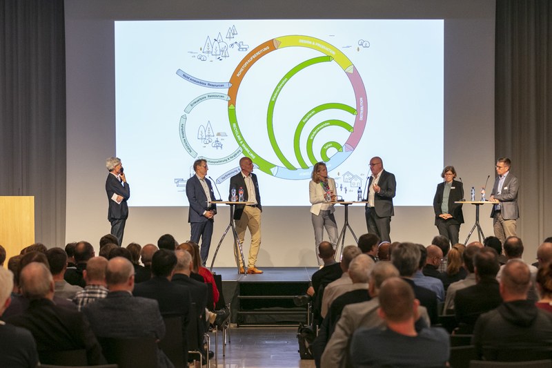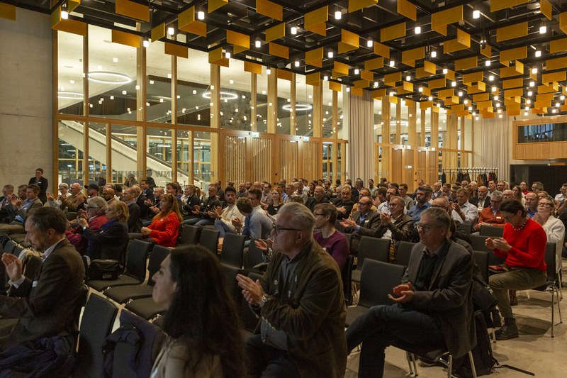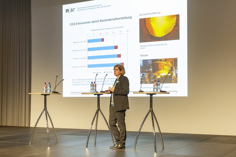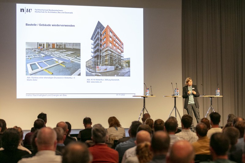 Die Hochschule für Architektur, Bau und Geomatik der FHNW war Mitgastgeberin des Anlasses im FHNW Campus Muttenz und mit einer Expertin für nachhaltiges Bauen, Prof. Barbara Sintzel, auf dem Podium vertreten. Sintzel brachte prägnant Argumente aus der angewandten Forschung ein, die für eine schnell einzuleitende Bauwende sprechen. «Das Klima wartet nicht auf unsere Entscheide», so Sintzel. Anhand konkreter Bauprojekte konnte sie zudem aufzeigen, dass recyclierte oder substituierende Baustoffe stärker zu nutzen wären und es sich – analog zu skandinavischen Ländern – lohnen dürfte, mittels Regulierungen Innovationen anzustossen. Die Folien zu ihrem Vortrag können hier heruntergeladen werden.Der Anlass war mit rund 170 Gästen gut besucht und hat rege Diskussionen angestossen. Weitere Eindrücke zum Anlass finden Sie hier sowie in der folgenden Bildergalerie.