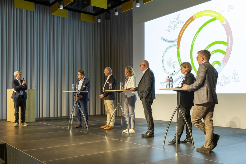 Regierungsrätin Esther Keller, Basel-Stadt, Regierungsrat Isaac Reber, Basel-Landschaft und Vertreter*innen der Bauverbände sowie unserer Hochschule diskutierten Lösungen für nachhaltiges Bauen. Bilder: Julian Salinas