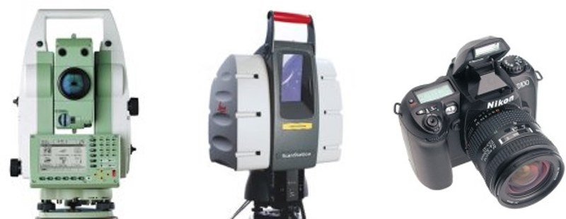 Instrumente zur Aufnahme von Objekten (von links nach rechts): Reflektorloser Tachymeter TPS1200, Terrestrischer Laserscanner Leica Scanstation2, Hochauflösende Digitalkamera Nikon D100