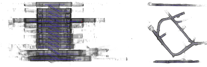 Entwicklung eines portablen Kamera-basierten 3D-Erfassungssystems BIMAGE Backpack mit Navigations- und Umgebungssensorik zur kinematischen Datenerfassung im Innen- und Aussenraum. Mit der integrierten Panoramakamera können pro Auslösung sechs Einzelbilder erfasst und anhand von LiDAR-SLAM-Algorithmen im 3D-Raum lokal positioniert und orientiert werden. Die Onboard-Erfassungssoftware erlaubt eine Fortschritts- und Qualitätskontrolle in Echtzeit auf einem mitgeführten Tablet (Blaser et al., 2018b). Entwicklung einer Simulationssoftware zur Evaluation optimaler Mehrkopf-Kamerakonfigurationen und Panoramagenerierung im Innen- und Aussenbereich.