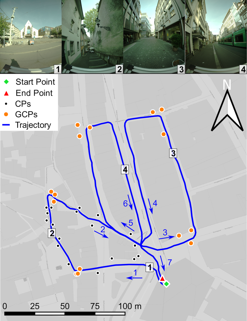 The first dataset was acquired in the city centre of Basel, Switzerland. The 800 m loop-shaped trajectory was recorded in 24 minutes. It includes different road and path widths including a large square with good GNSS reception for system initialization. By contrast, it also includes narrow alleys only accessible to pedestrians with steps and slopes up to 16 %. Wide pedestrian promenades with shops on both sides dominate other parts of the trajectory. In addition, there is a main traffic axis through the city centre with busy tram and bicycle traffic.