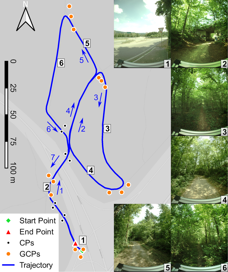 The second dataset was acquired in a partially dense forest. Its trajectory length amounts to 740 m and the data capture required 25 minutes. It also incorporates an area with good GNSS reception at a nearby highway exit for system initialization. Furthermore, the forest path leads through a road underpass. Narrow paths only accessible to pedestrians with dense vegetation at ground level dominate the scenery in images 3 and 6 of the following Figure. In addition, the trajectory also includes drivable forest roads with less dense vegetation. The ‘forest’ dataset includes 843 panoramic images, approx. 850 million LiDAR points and navigation data in the scope of the first dataset. We provide 15 GCPs arranged in groups of three and 8 CPs along the first segment of the trajectory (see map below). All points are marked with photogrammetric targets and fixed either on trees or on driven-in pillars. The reference points were determined by tachymetry with closed polygons have a 3D standard deviation of 5 mm.