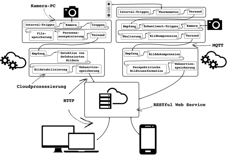 Detaillierte, bildbasierte Dokumentationen von, beispielsweise Baustellen oder meteorologischen Vorgängen, sind gefragt wie nie zuvor. Diese Bedürfnisse können heutzutage dank hochaufgelösten Kamerasystemen und grosser Bandbreite in der mobilen Datenübertragung bis zu einem gewissen Grad befriedigt werden. Jedoch sind diese Sensorinstallationen im Normalfall isolierte Einzellösungen und oft auf die spezifischen Anwendungen zugeschnittene teure Massanfertigungen. Die Entwicklungen der letzten Jahre von neuen Technologien für das Internet of Things (IoT) , zusammen mit der Rechenleistung von Kleinst-PCs und den Bandbreiten in der mobilen Datenübertragung, erlauben es heute die Kamerasystem-Massanfertigungen durch ein flexibel einsetzbares, modulares Netzwerk von Sensoren sowie Kommunikations-, Bearbeitungs- und Analysemodulen zu ersetzen. Neben Kameras können weitere Sensoren, z.B. für Helligkeitsmessungen, ins Netzwerk eingebunden und die gemessenen Werte unter anderem für die Steuerung von Ereignissen, wie der Kameraauslösung, verwendet werden. Ein solches System kann einfach an verschiedene Bedürfnisse angepasst, kostengünstig umgesetzt und wenn nötig modular erweitert werden.