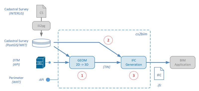 Im Forschungsprojekt «cs2bim» wird im Rahmen eines Direktauftrag ein open-source-Ansatz entwickelt, welches die Modelltransformation der amtlichen Vermessungsdaten der Schweiz von 2D nach 3D, flächendeckend für die Schweiz zur Verfügung stellt.