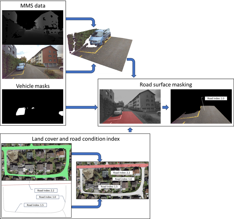 Die Vorbereitung und Analyse der Rohdaten ist ein wesentlicher Bestandteil des Trainingsprozesses im Bereich maschinelles Lernen. Während einfache numerische Daten wie z.B. die Strassenzustandsindizes leicht zu verarbeiten sind, stellen Bilddaten eine grössere Herausforderung dar. In diesem Fall werden verschiedene Photogrammetrie- und Computer Vision-Methoden auf mobile Mapping-Daten angewendet, um Objekte bzw. Bildbereiche auszuschliessen, die für die Anwendung nicht relevant sind. Im Projekt werden beispielsweise Fahrzeuge oder Bereiche ausserhalb der eigentlichen Fahrbahn automatisch detektiert und ausmaskiert. Als Resultat werden nur die relevanten Bereiche der Strassenoberfläche und die entsprechenden Zustandsindizes dem neuralen Netzwerk vorgelegt.
