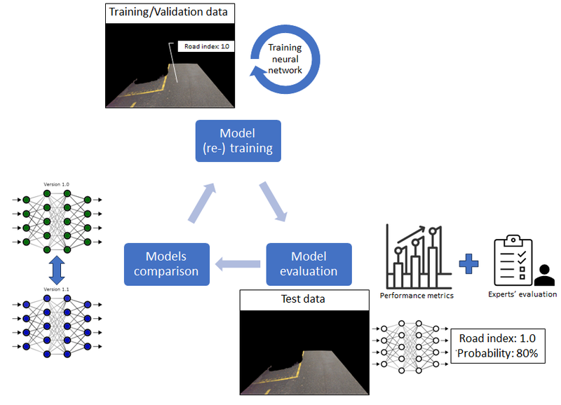 Um das System flexibel zu gestalten und die Qualität der Ergebnisse laufend zu optimieren, wird eine iterative und inkrementelle Methode integriert. Auf der einen Seite werden allfällige Korrekturen der Ergebnisse von Strassenzustandsprofis als neue Trainingsdaten verwendet, auf der anderen Seite integriert die Architektur zusätzliche Daten wie z.B. automatisch detektierte Einzelschäden.Um das System flexibel zu gestalten und die Qualität der Ergebnisse laufend zu optimieren, wird eine iterative und inkrementelle Methode integriert. Auf der einen Seite werden allfällige Korrekturen der Ergebnisse von Strassenzustandsprofis als neue Trainingsdaten verwendet, auf der anderen Seite integriert die Architektur zusätzliche Daten wie z.B. automatisch detektierte Einzelschäden.