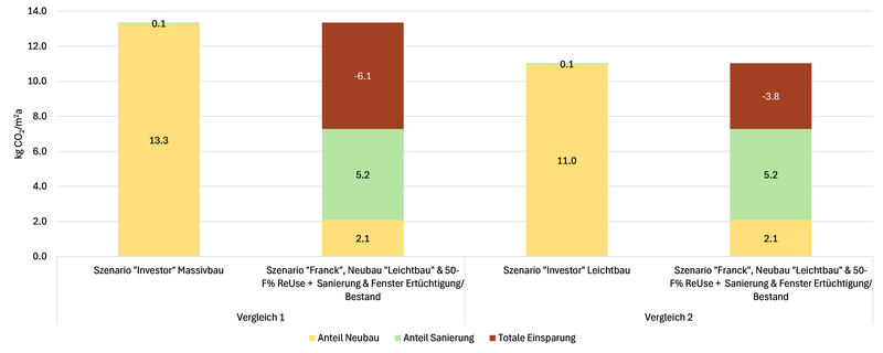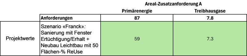 Das Institut Nachhaltigkeit und Energie am Bau (INEB) wurde 2023 beauftragt, die geplante Arealentwicklung anhand von verschiedenen Szenarien mit dem SIA 390/1-Tool zu bewerten und mit einer herkömmlichen Quartierentwicklung zu verglichen. Ziel ist einerseits die Einsparung der auf Wiederverwendung basierten Arealentwicklung und anderseits die Einhaltung der ambitionierten Netto-Null-basierten Zusatzanforderungen des SIA-Klimapfades aufzuzeigen. Es hat sich gezeigt, dass der Bestandserhalt von Gebäuden eine zentrale Voraussetzung für das Erreichen des arealübergreifenden Benchmarks ist.