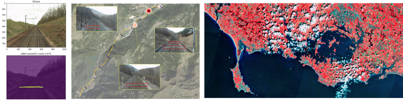 Datenquellen: KI-basierte Detektion von Wildwechseln auf bahngestützten Mobile-Mapping-Bilddaten im Burgund (links), multispektrales Sentinel-2 CIR Falschfarbenbild zu Klassifikation von Landschaftsmerkmalen in der Bretagne (rechts).
