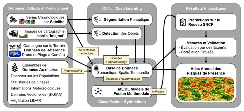 Als Datengrundlage der Modelle nehmen Satelliten-Zeitreihen und Mobile Mapping eine Schlüsselrolle ein. Während hochauflösende Multispektraldaten des Sentinel-2 Satellitenprogramms der ESA je nach Bewölkung alle sechs Tage die Möglichkeit bieten, ein klassifizierbares Landschaftsmodell für ganz Frankreich zu berechnen, können Mobile Mapping-Bilder (Imajnet) verwendet werden, um besonders stark frequentierte Wildwechsel zu lokalisieren, die sich beispielsweise durch verfärbten Schotter bemerkbar machen. Zusätzliche modellrelevante Informationen sollen beispielsweise aus LIDAR-Punktwolken extrahiert, sowie aus landwirtschaftlichen, jagdlichen und klimatologischen Diensten integriert werden.