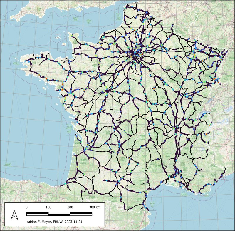 Beispielausschnitt aus dem Kollisionsatlas für einen nächstjährigen Wintermonat: Prädiktive Karte mit modellierten Kollisionsrisiko-Hotspots (Farbrampe Risiko blau-niedrig bis rot-hoch) auf Teilen des Schienennetzes der SNCF (schwarz).