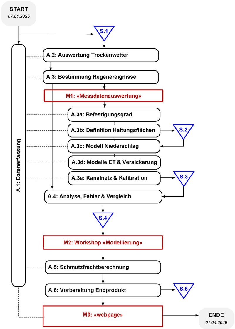Diese praxisnahen Untersuchungen sollen einen Beitrag zur zukunftsorientierten Siedlungsentwässerung und zum Gewässerschutz vor dem Hintergrund eines kontinuierlichen Klimawandels leisten. Dafür wird, in Zusammenarbeit mit der Stadt Zürich (Entsorgung + Recycling Zürich, ERZ), für ein ausgesuchtes Pilotgebiet (Zürich‐Nord) mit hoher räumlicher und zeitlicher Auflösung der Wasserhaushalt des Entwässerungssystems bestimmt und ein Werkzeug zur Lokalisierung von Schadstoffquellen ausgearbeitet. Mit neuen Ansätzen werden hochaufgelöste Eingabedaten (Niederschlag, Temperatur, Wasserverbrauch, Luftbilder, etc.) zur Bestimmung von Versiegelungsgraden, Oberflächen und Vegetation für hydrologische Modelle verwendet und anschliessend mit einem hydrodynamischen Kanalnetzmodell gekoppelt. Hierbei werden die einzelnen Schritte jeweils mit einfachen Methoden (d.h. «basic»), herkömmlichen Methoden (d.h. «status‐quo») und neuen Methoden mit hochaufgelösten Daten (d.h. «Innovation») durchgeführt und miteinander verglichen.
