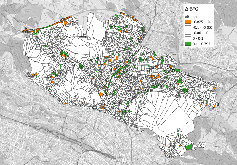 Die Karte ΔBFG (alt − neu) zeigt räumliche Abweichungen. Grün = Innovation, erkennt mehr Befestigung, Orange = weniger. Die Hauptabweichungen ergeben sich entlang von Verkhersachsen und bei Grossüberbauungen.