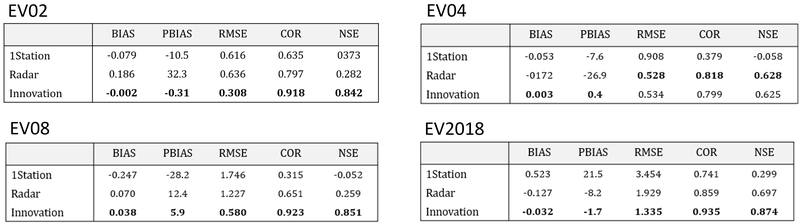 Der PBIAS der «Innovation» liegt bei allen vier Ereignissenzwischen −1.7% und +5.9%. Weder die Einzelstation (−28.2% bis +21.5%) noch der Radar (−26.9% bis +32.3%) erreichen diese Stabilität. Die Zusammenführung der Radardaten und Bodenstationen eliminiert den systematischen Fehler also weitestgehend, unabhängig vom Ereignistyp. Die Methode wirkt in zwei Stufen: erstens Bias-Anpassung durch die Bodenstationen, zweitens Varianzreduktion durch die verbesserte räumliche Auflösung. Bei Events mit geringer räumlicher Variabilität dominiert der erste Effekt, bei konvektiven der zweite. Die Korrelation bleibt durchgehend über 0.79 und die NSE-Werte der «Innovation» (0.625–0.874) zeigen, dass die Methode über alle Ereignisse hinweg gute bis sehr gute Schätzungen liefert.
