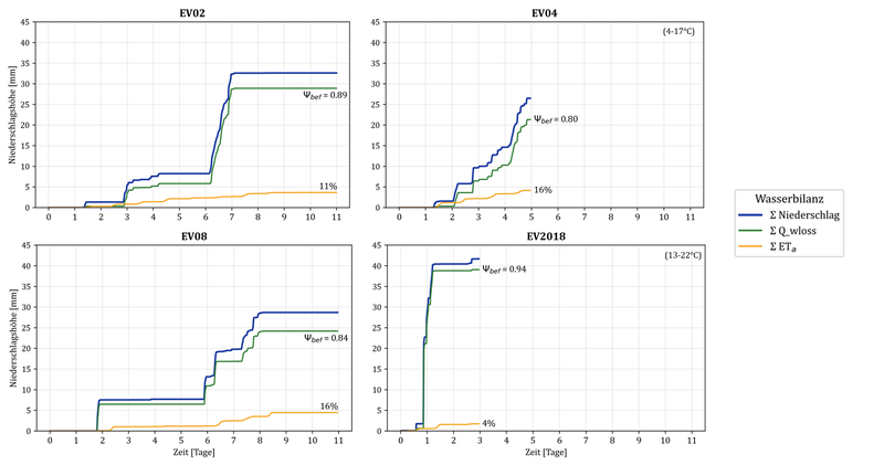 Die Wasserbilanz der vier Ereignisse verdeutlicht den Einfluss von Jahreszeit und Ereignisstruktur. Der Vergleich von EV02 (Februar) und EV08 (August) zeigt den saisonalen Effekt: Im Sommer verdunstet mit 16% gegenüber 11% im Winter deutlich mehr. EV04 (April) weist mit ψ_bef = 0.80 den tiefsten Abflussbeiwert auf, da die verteilte, kleinteilige Ereignisstruktur höhere Verdunstungsanteile begünstigt. EV2018 als Extremereignis erreicht dagegen mit ψ_bef = 0.94 und nur 4% Verlusten den höchsten Abflussbeiwert, da die hohe Niderschlagsintensität die Verlustvolumen übersteigt.