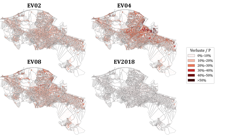 Die vier Karten zeigen räumlich heterogene Verluste als Funktion von Haltungsflächeneigenschaften, Ereignistyp und Jahreszeit. EV04 weist die stärkste räumliche Heterogenität auf. Das Extremereignis (EV2018) zeigt das homogenste Muster, da Anfangsverluste und Verdunstung anteilsmässig an Bedeutung verlieren. Die Verluststruktur ist damit ereignisspezifisch und lässt sich nicht allein über den Flächentyp erklären.