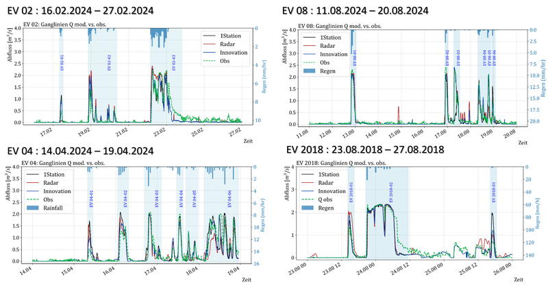 Zur quantitativen Bewertung der drei Niederschlagsansätze wurden die simulierten Abflussganlinien am Auslass des Kanalnetzes mit den beobachteten Abflüssen verglichen. Die folgenden Ganglinien und Zielfunktionen zeigen die Modellgüte für die vier ausgewählten Ereignisse.