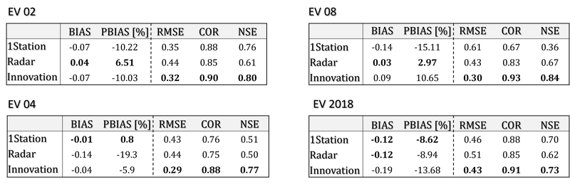 Die Metriken sind zweigeteilt: links BIAS und PBIAS (Zentralität des Fehlers), rechts RMSE, COR und NSE (Streuung und Modellanpassung). Die Innovation liefert durchgehend die beste Fehlerstreuung (tiefster RMSE, höchste Korrelation, höchster NSE) über alle vier Events. Besonders ausgeprägt ist der Unterschied bei EV04 und EV08, wo der Niederschlag räumlich stark variiert. Der BIAS und PBIAS der Innovation schneidet teils schlechter ab als die einfacheren Ansätze, obwohl Kreuzvalidierung des Niederschlags (siehe A.3c - Modell Niederschlag) gezeigt hat, dass die Innovation nahezu bias-frei ist. Diese Verschiebung der Fehlerzentralität entsteht durch systematische Fehler bei der Abbildung und Modellierung des Kanalnetzes (Pumpregeln, Regulierunge etc.). Der verbesserte Input deckt also Schwächen im hydraulischen Modell auf, die bei schlechterem Input im Rauschen untergegangen sind.