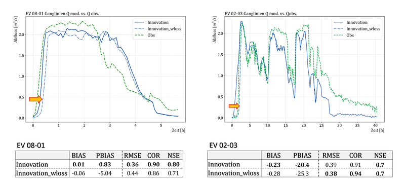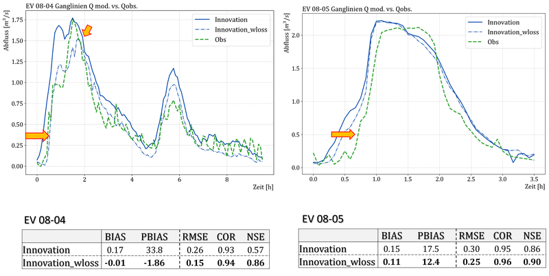 Die Berücksichtigung der Verluste verbessert die Abbildung des Anstiegs der Abflussganglinie, auch wenn die simulierte Abflussspitze dadurch etwas tiefer ausfällt. Die Pfeile markieren weitere Stellen, an denen die Modellanpassung durch die Verlustmodellierung sichtbar verbessert wird. Die Zielfunktionen bestätigen, dass die Inklusion der Verluste in diesen Sub-Events zu einer besseren Modellanpassung führt. Das gilt allerdings nicht generalisierbar für alle Sub-Events. Der Effekt ist ereignis- und saisonabhängig.