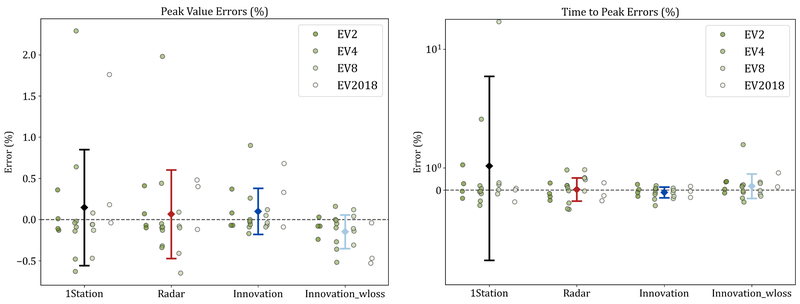 Das Innovationsmodell liefert die robusteste Performance mit der geringsten Standardabweichung und den wenigsten Ausreissern (diese entsprechen typischerweise nicht erkannten Abflussspitzen). Die Inklusion der Verluste führt zu einer Verschiebung der Fehler nach unten, d.h. die simulierten Spitzen fallen konsistent tiefer aus als die gemessenen. Analog wurde der prozentuale Fehler der Eintrittszeit der Abflussspitze über alle Events ausgewertet. Auch hier zeigt das Innovationsmodell die geringste Fehler.