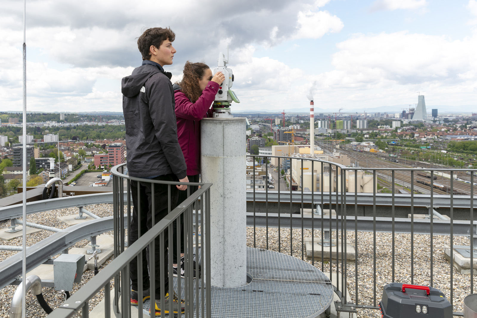 Geomatik-Studierende bei Vermessungen auf dem Dach des FHNW Campus Muttenz.