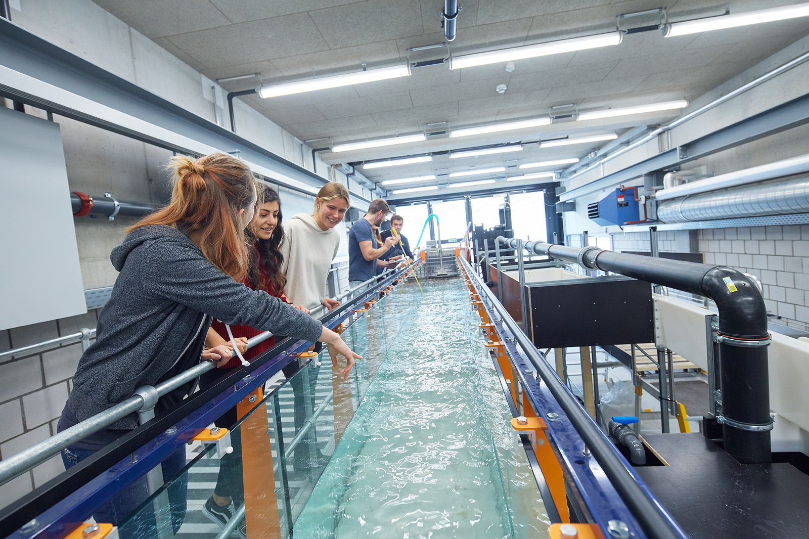Studierende des Bachelor-Studienganges Bauingenieurwesen an der 15 Meter langen Wasserrinne im Baulabor FHNW.