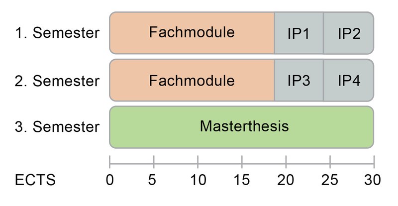 Die Studiendauer im Vollzeitstudium beträgt drei Semester. In den ersten beiden Semestern belegst du Fachmodule im Umfang von jeweils 18 ECTS und arbeitest an Integrationsprojekten mit jeweils 12 ECTS. Im dritten Semester verfasst du deine Masterthesis, die mit 30 ECTS gewichtet ist.