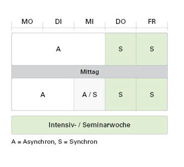 Im Wochenstundenplan sind zwei Tage für Veranstaltungen reserviert, bei denen deine physische erforderlich ist. Zusätzlich gibt es pro Semester ausgewählte Mittwochnachmittage als Synchrontage. Dadurch bleibt dir während des Studiums viel zeitliche Flexibilität.