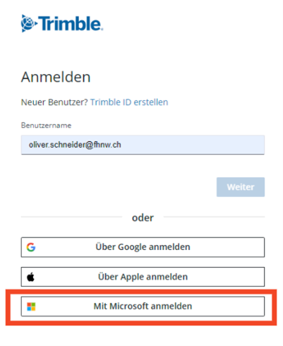 Die TrimbleID kann direkt mit dem Microsoft Account der FHNW E-Mail Adresse erstellt werden («Mit Microsoft anmelden» auswählen).