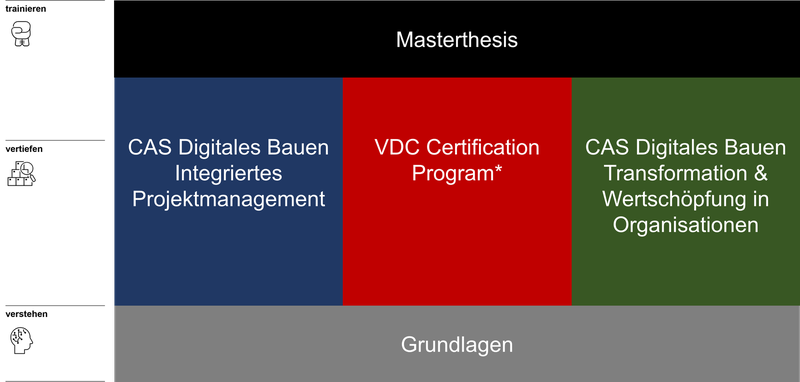 Das «VDC Certification Program*» ist ein Pflichtbestandteil des Weiterbildungsmasters und muss für den MAS FHNW Digitales Bauen zwingend abgeschlossen sein. Ein anderes der CAS im Rahmen von 15 ECTS Punkten kann bei Bedarf substituiert werden.