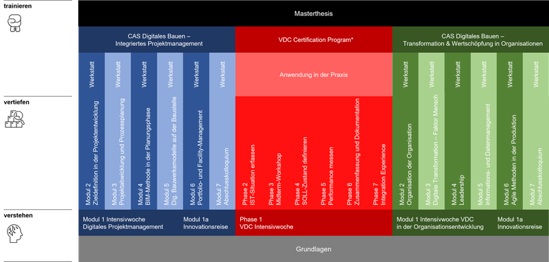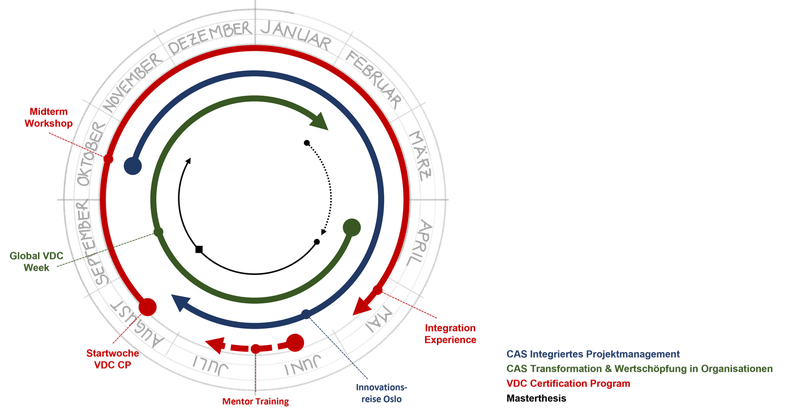 Wichtig: eines der beiden CAS kann durch ein anders, thematisch passendes CAS subsituiert werden. Das VDC Certification Program ist ein Pflichtbestandteil.
