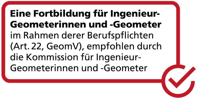 Diese Weiterbildung zählt als Fortbildung für die Ingenieur-Geometerinnen und -Geometer und wird von der Kommission für Ingenieur-Geometerinnen und -Geometer empfohlen.