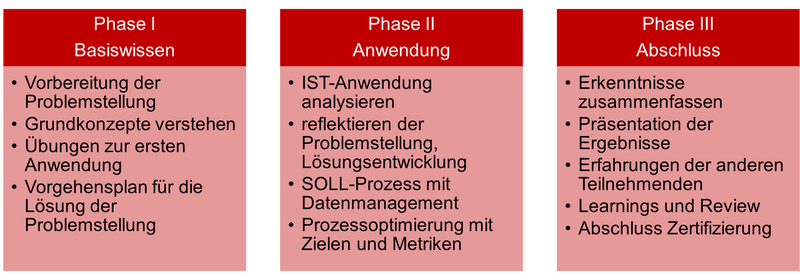 Das Programm ist berufsbegleitend aufgebaut. So können Sie Ihre neu gewonnenen Kompetenzen direkt in Ihren Berufsalltag integrieren – insbesondere während der praktischen Projektarbeit in Phase II. Auf diese Weise erzielen Sie nicht nur Lernerfolge, sondern auch einen unmittelbaren Mehrwert für Ihre Arbeit.