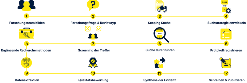 Die Durchführung eines systematischen Reviews sollte durch ein interdisziplinäres Forschungsteam erfolgen. Dazu zählen Fachexpert:innen, je nach Anforderungen Methodenexpert:innen (z. B. für Statistik, qualitative Methoden) und Informationsspezialist:innen Das Hinzuziehen von Informationsspezialist:innen für Schritte wie die Entwicklung und Dokumentation der Suchstrategie erhöht nachweislich die Qualität des Suchprozesses (Lefebvre et al., 2025).