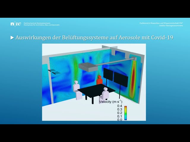 Unter den gut bekannten Übertragungswegen des SARS‐CoV‐2 Virues wurde der Einfluss der Belüftungssysteme für typische Büroräume der FHNW auf die Aerosole mit Hilfe einer 3D‐Simulation untersucht. Hierbei zeigte sich, dass die Position der Be‐ und Entlüftungssysteme, der Luftmassestrom, die Positionierung einzelner Arbeitsplätze und verschiedene Gegenmassnahmen einen erheblichen Einfluss auf die Ausbreitung der Aersole haben. Es zeigte sich, dass die Minimum Wartezeit nach Kontamination 8‐10 Minuten betragen sollte, wobei unterschiedliche Flächen und Bereiche einer Dekontamination erfordern.