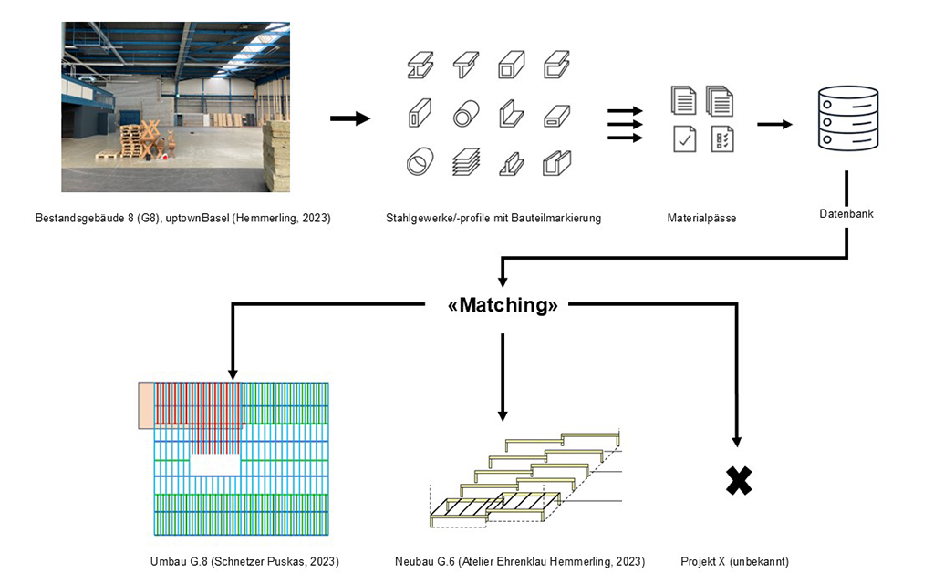 In uptownBasel ist grosses Potenzial für die lokale Wiederverwendung gegeben, denn Rückbauort, Werkhalle, Lagerplatz und Einbauort befinden sich auf demselben Areal. Beim teilweise zum Rückbau vorgesehenen Gebäude 8 handelt es sich um eine ehemalige Industriehalle mit einer sichtbaren und direkt zugänglichen Stahlstruktur. Dies ist insofern von Bedeutung, da Stahl viel Energie zur Herstellung benötigt und eine direkte Wiederverwendung von Stahlprofilen in einem Neu- oder Umbau zu einer Reduktion von Treibhausgasemissionen beitragen kann.