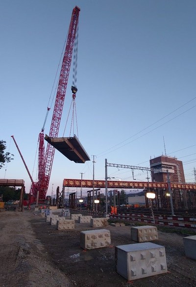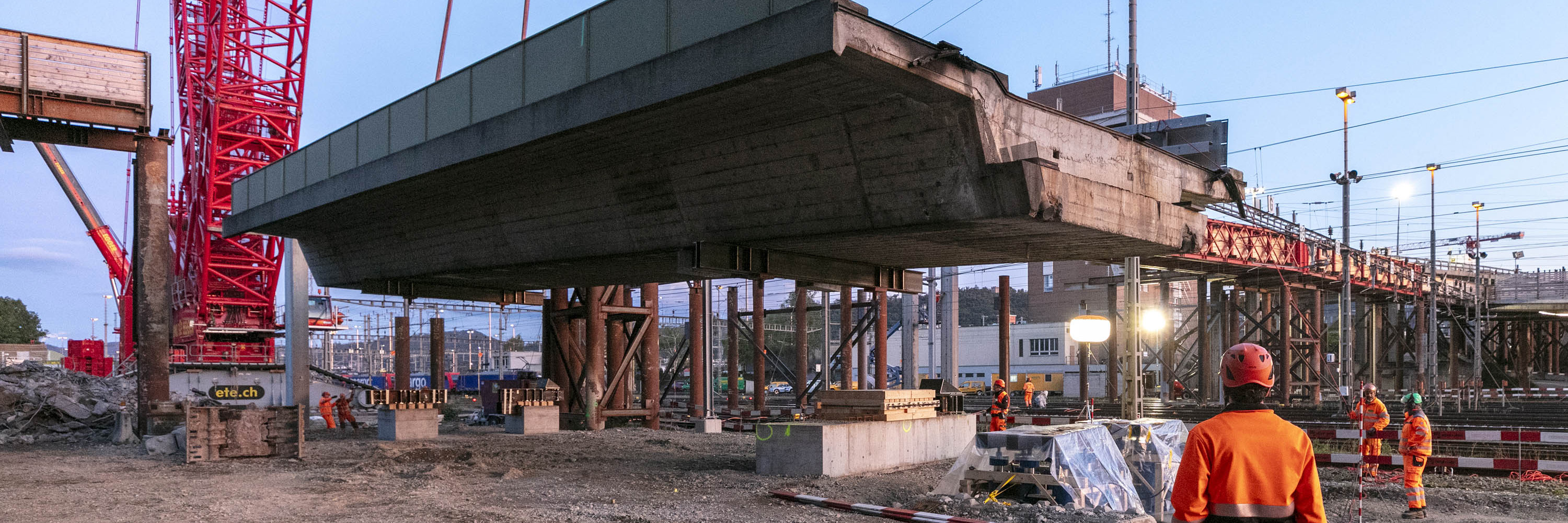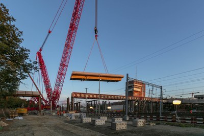 Das Brückenelement gehört zum ersten Abschnitt der Grenzacherstrasse in Muttenz und wurde am Wochenende vom 14. und 15. September 2024 präzise mit dem grössten Raupenkran der Schweiz auf den Versuchsstand gesetzt.