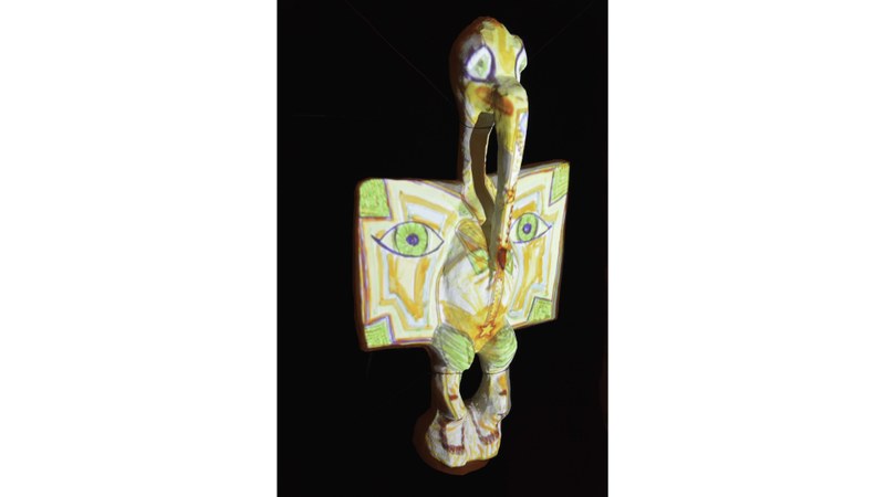 Ohne seine Bemalung, ohne sein Federkleid ist ‹Initula› ein neutrales Objekt, das nicht wertet. Sobald es über den Projektor seine Muster und sein Federkleid erhält, wird der Vogel wieder flügge und erzählt von der weiten Welt, von den unterschiedlichen Menschen, von Kindern und Alten, es zeigt uns Farben und Formen, Krankheiten und Genesung, Sternbilder und Atome – schlicht alles, was die Mitarbeitenden des Swiss TPH dem Objekt mit auf den Weg geben wollen. Dadurch, dass ‹Initula› all diese Stimmen aufnimmt und reflektiert, kommt es wieder dahin, wo ich den Ursprung der Senufo-Vögel vermute: zu den Überlieferungen der ersten lebenden Wesen – zum Anbeginn der Zeit und seiner Verknüpfung zum Hier und Heute.»