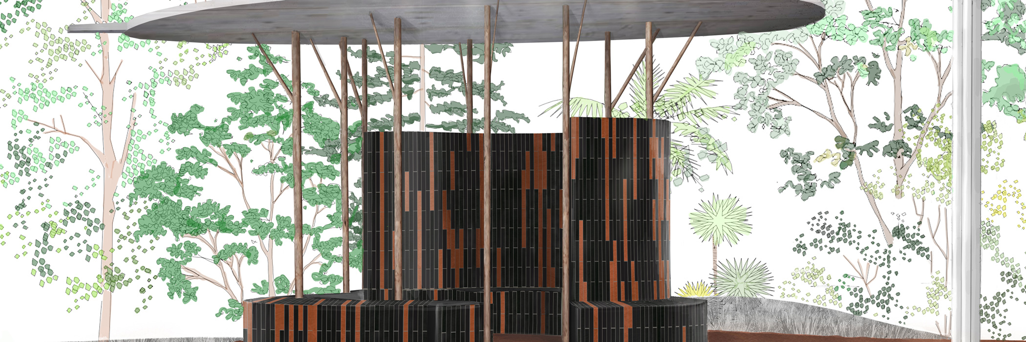 «From Ashes» befasst sich mit der Präsenz von Eukalyptusbäumen in Äthiopien und bindet eine besondere Töpferkultur in die Architektur ein. Das Projekt umfasst einen Pavillon im Park der Botschaft und die Neukonzeption und Gestaltung der Innenwand zwischen Visa-Bereich und Kanzlei. Beides wird aus Ziegeln gemauert, die in Zusammenarbeit mit der Kechene Women’s Pottery Cooperative in Addis Abeba entwickelt und hergestellt werden.