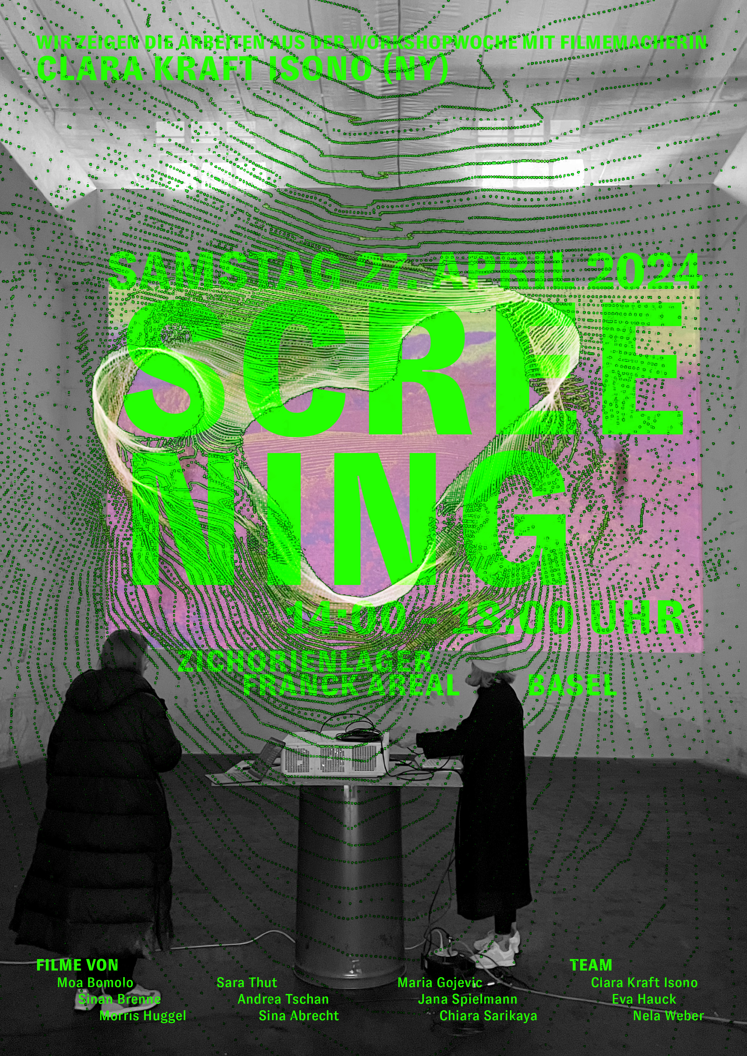 Ebenfalls im Rahmen von Open House Basel präsentieren neun Studierende desselben Studienganges am Samstag, 27. April, von 14 bis 18 Uhr in einem der Silos auf dem Basler Franck-Areal drei Kurzfilme zur Raumwahrnehmung, die im Rahmen des Semesterprojektes in Zusammenarbeit mit der Filmemacherin, Dozentin und Architektin Clara Isono Kraft und Prof. David Grimm vom Institut für Geomatik der Hochschule für Architektur, Bau und Geomatik FHNW entstanden sind.
