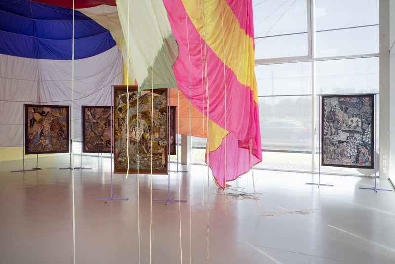Die räumliche Intervention von Kathrin Siegrist, zweifache Master-Absolventin des Institute Art Gender Nature (IAGN) und des Institute Arts and Design Education (IADE) sowie aktuelle Leiterin der Malwerkstatt des IADE, aus modifiziertem und gefärbtem Fallschirmstoff fungiert im TANK als eine Art als Decke, welche die Werke von Regula Humm sowohl umfasst als auch vor Licht schützt.