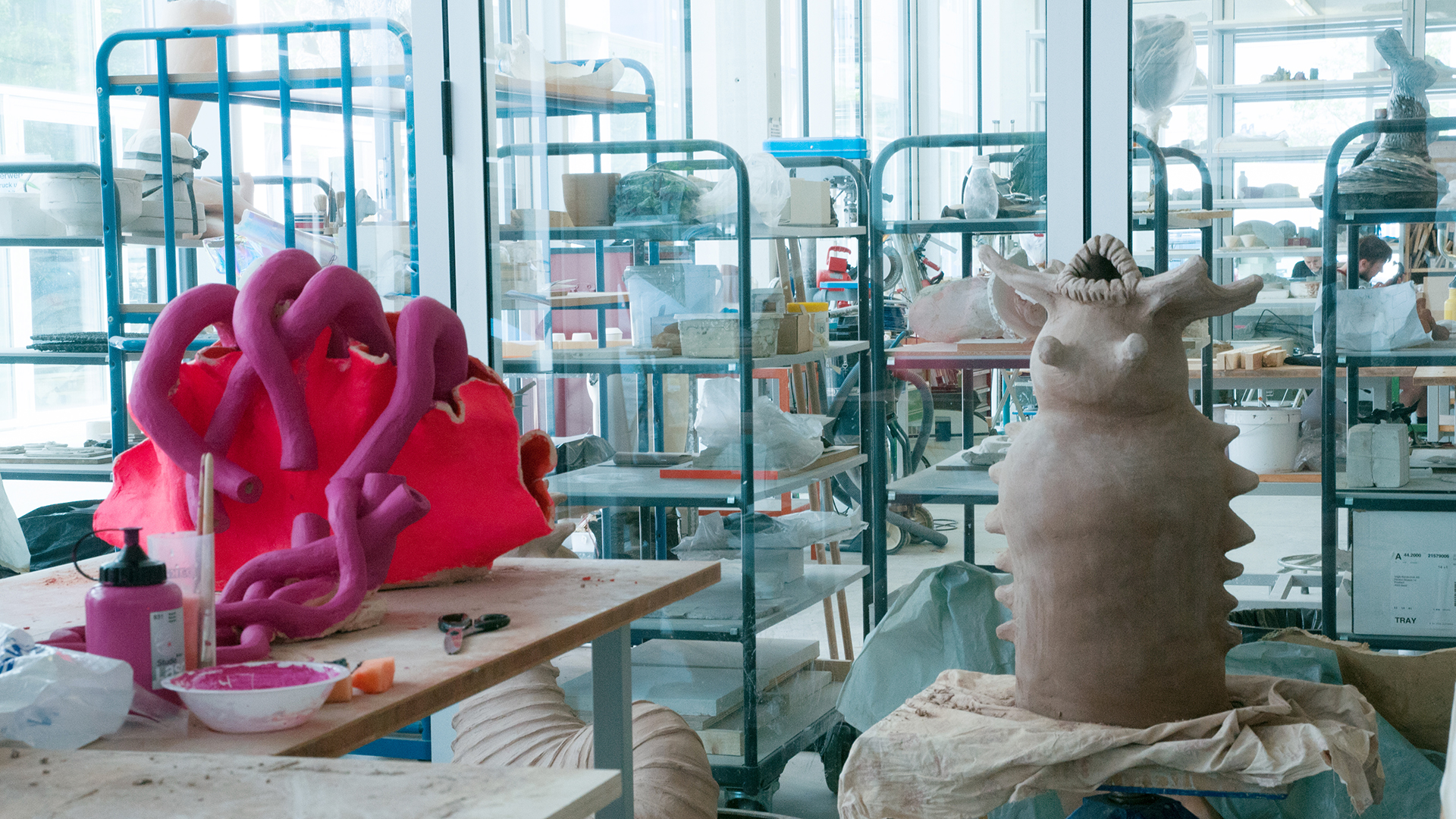 Die Studierenden arbeiten zum Beispiel an Skulpturen, Objekten & Installationen, an Modellen, an architektonischen Modellen sowie an Körperabformungen und Accessoires. In der Bildhauerwerkstatt Basiswissen wird der Umgang mit räumlichem Gestalten erprobt.